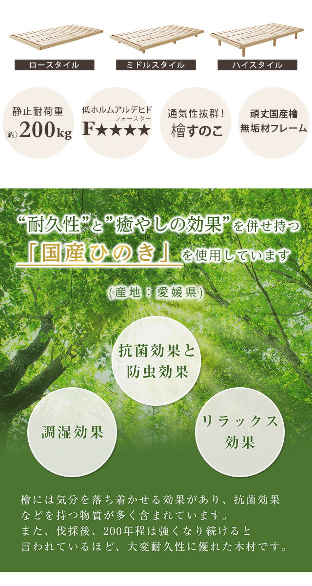 【商品について】総檜脚付きすのこベッド(シングル) 【Pierna-ピエルナ-】■サイズ:■【商品サイズ】縦98×横200×高さ26cm【商品重量】16.8kg■カラー:ナチュラル■素材:材質:総ヒノキ■その他:■梱包サイズ:(約100×37×16cm■梱包重量:(約)17.5kg【関連商品】3段階高さ調節 国産総檜脚付きすのこベッド 【Pierna-ピエルナ-】(ポケットコイルロールマットレス付き) シングル3段階高さ調節 国産総檜脚付きすのこベッド 【Pierna-ピエルナ-】(ポケットコイルロールマットレス付き) セミダブル3段階高さ調節 国産総檜脚付きすのこベッド 【Pierna-ピエルナ-】(ポケットコイルロールマットレス付き) ダブル総檜脚付きすのこベッド(シングル) 【Pierna-ピエルナ-】総檜脚付きすのこベッド(セミダブル) 【Pierna-ピエルナ-】総檜脚付きすのこベッド(ダブル) 【Pierna-ピエルナ-】総檜脚付きすのこベッド(シングル) 【Pierna-ピエルナ-】 【注意事項】メーカー直送の商品となりますので、「代金引換」払いは不可となります。