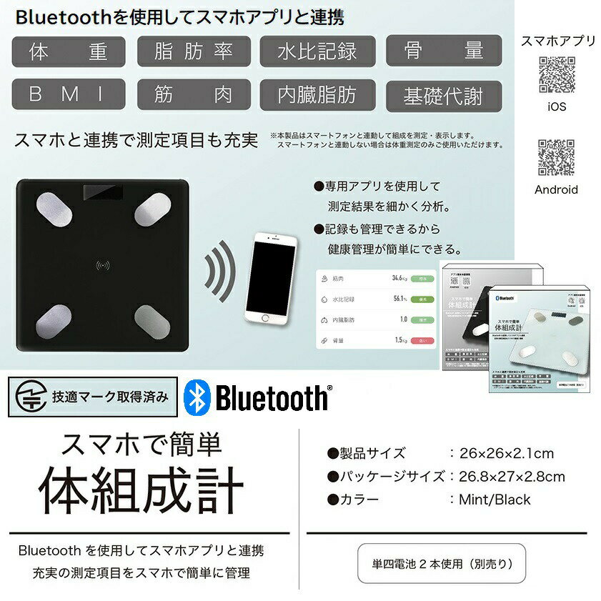 体重計 スマホ連動 体組成計 体脂肪計 高精度 体重/体脂肪率/水分率/骨量/基礎代謝量/内臓脂肪レベル/BMIなど測定 Bluetooth対応 ダイエット 体重管理 肥満予防 iOS/Androidアプリで健康管理 電池付き スマートスケール