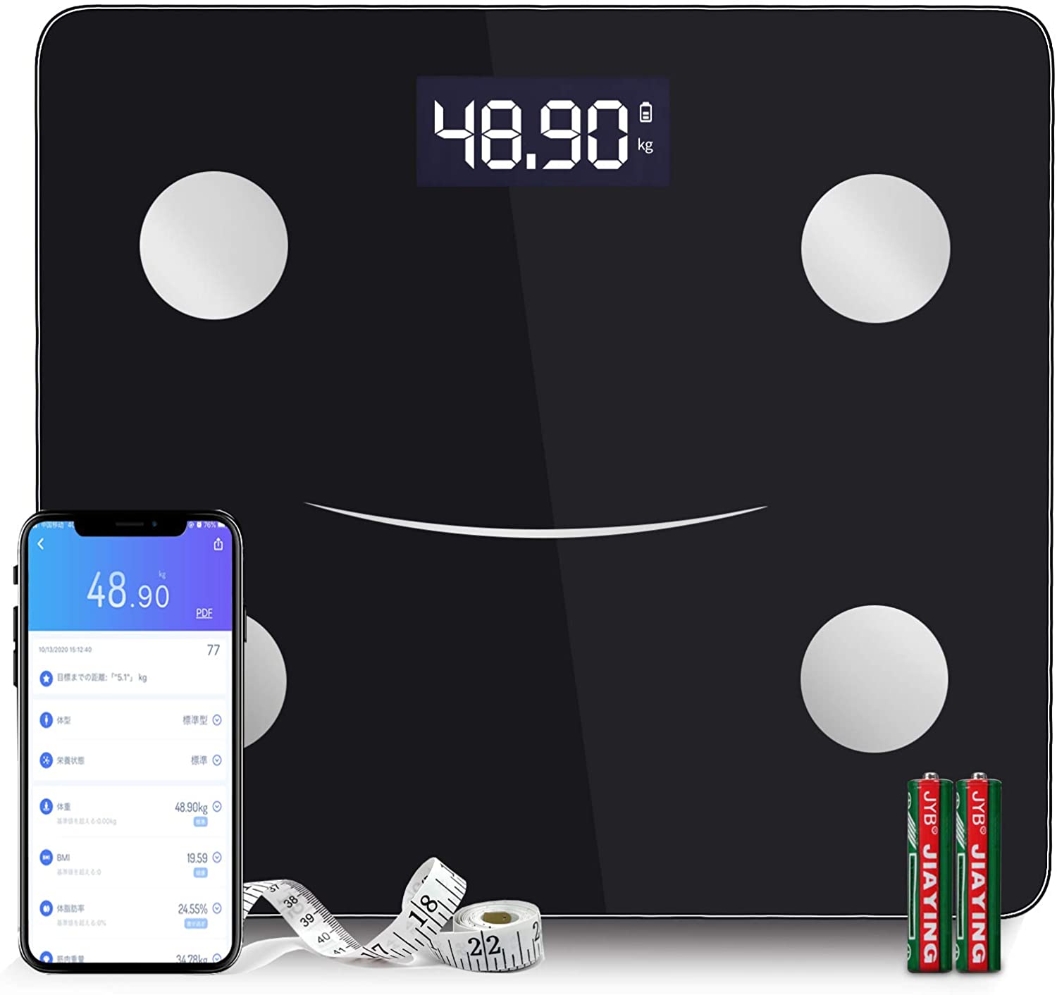 体重計 体組成計 体脂肪計 Bluetooth スマホ連動 薄型 体脂肪率やBMIや体水分率や基礎代謝 180 kgまで 健康管理 ダイエット 電池付き 日本語説明書付き (ブラック)